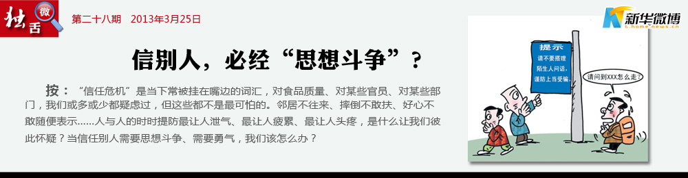 【可怕的“信任危機(jī)”】 賣包子的不吃自己做的包子,種菜的不吃自己種的菜,賣藥的不敢吃自己生產(chǎn)的藥,賣奶粉的則從不吃國(guó)產(chǎn)的奶粉……當(dāng)造假作假成為一種風(fēng)氣,甚至成為一種理所當(dāng)然時(shí),每個(gè)人能做的就只剩兩件事了:一個(gè)是只信自己,另一個(gè)是絕不信別人。