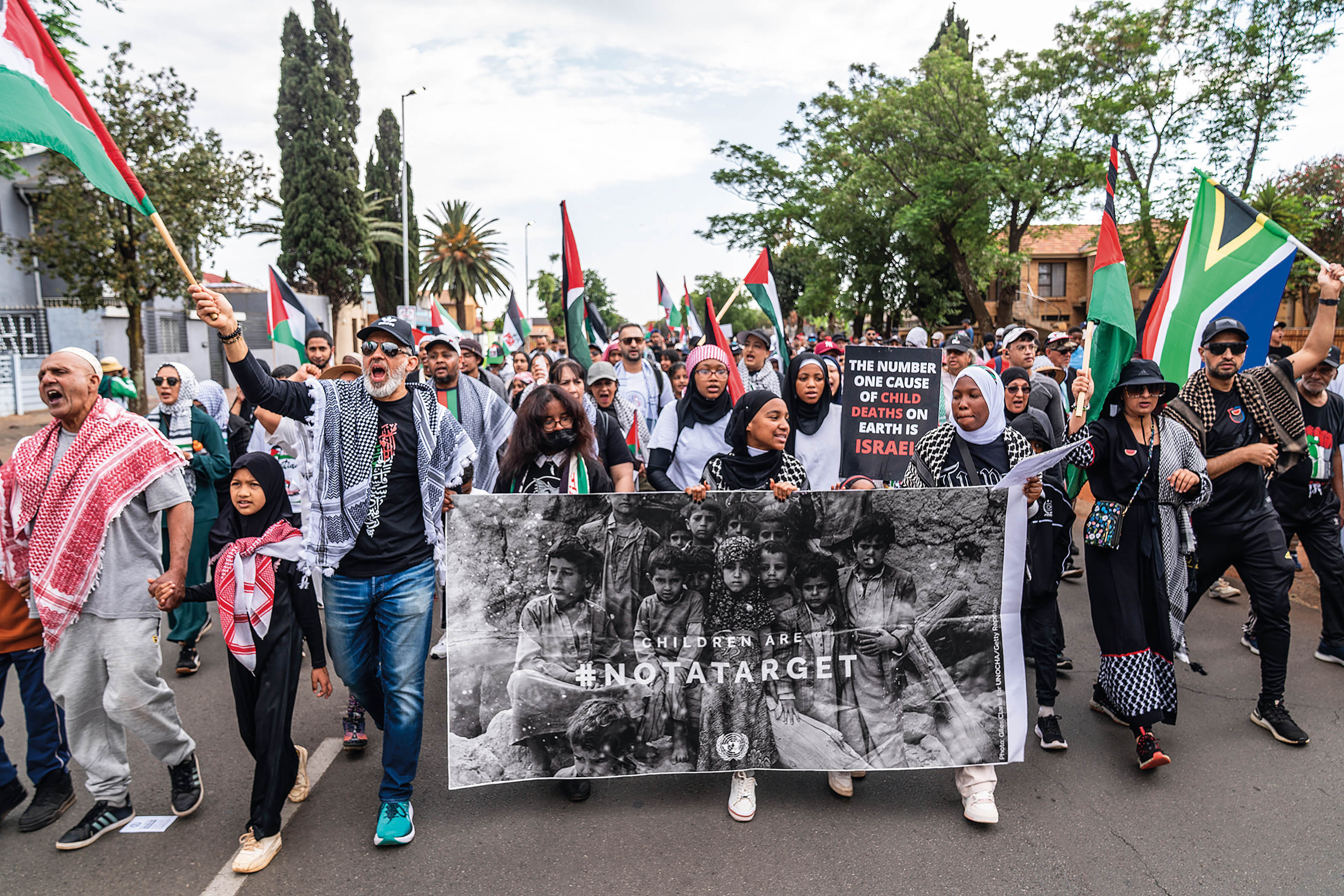 10月5日,数百民众在南非约翰内斯堡参加游行示威活动,抗议以色列在加沙地带军事行动以及拦截向加沙地带运送人道主义物资的“全球坚韧船队”并扣押包括多名南非公民在内的活动人士,要求以色列立即结束军事行动、释放被扣押的活动人士。这是当天在南非约翰内斯堡拍摄的游行示威现场