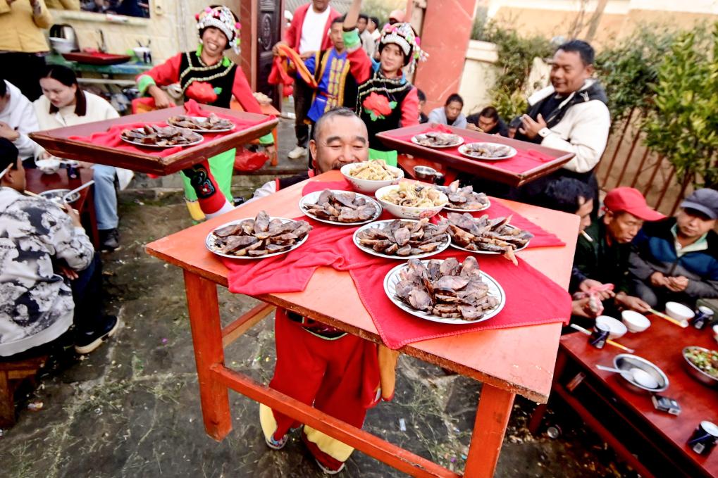 每逢节庆喜事,彝乡处处可见跳菜队伍跃动的身影。他们口衔方桌、手托菜盘,在锣鼓与唢呐声中腾挪跳跃,于惊险与平稳之间,将菜肴与欢乐一同送至宾客面前。
