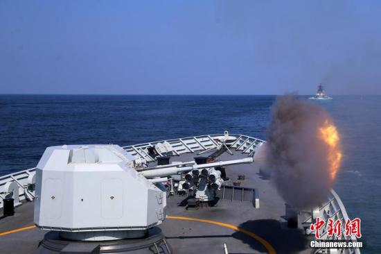 9月18日,“黃山艦”主炮開炮。當日,中俄“海上聯合-2016”軍事演習展開實際使用武器演練。 中新社記者 韓海丹 攝