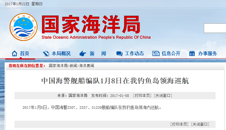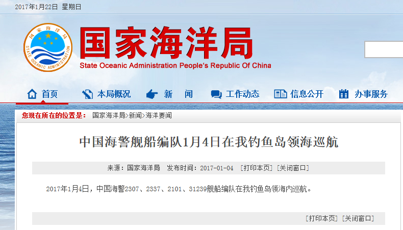 新華網北京2月18日電 據國家海洋局網站報道,2017年2月18日,中國海警2401、2337、2101、2106艦船編隊在我釣魚島領海內巡航。