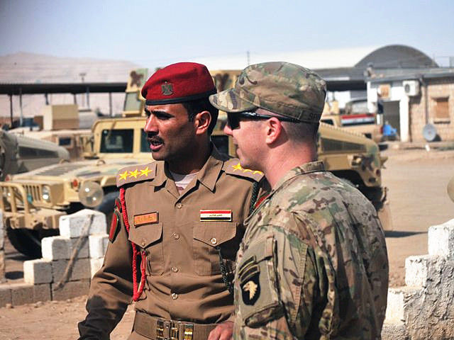 2016年9月6日,伊拉克斯威夫特營(yíng)地,美軍打擊部隊(duì)軍官與伊拉克軍官交談。(新華/美聯(lián))