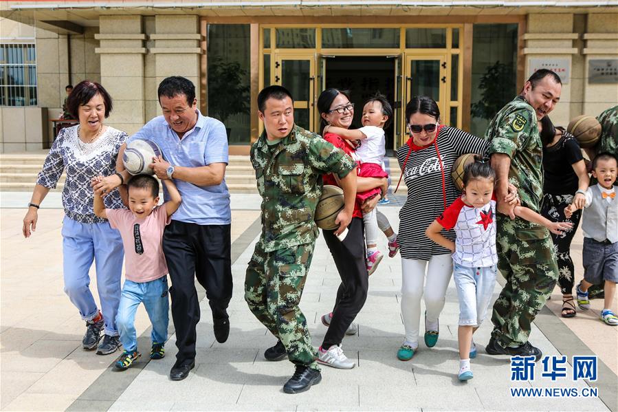 ?7月25日,在新疆邊防總隊奇臺邊防大隊,警官與家屬一起玩親子籃球游戲。新華社記者李京 攝