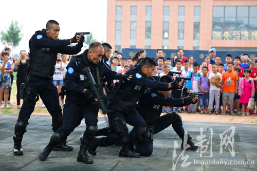 圖為特戰隊員為小學生們進行“維和礪劍”科目表演