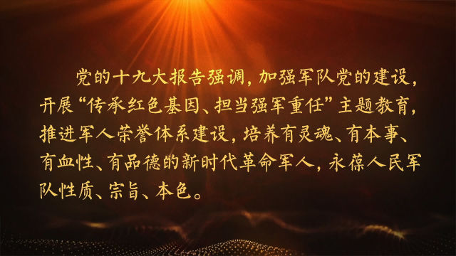 黨的十九大報(bào)告強(qiáng)調(diào),加強(qiáng)軍隊(duì)黨的建設(shè),開(kāi)展“傳承紅色基因、擔(dān)當(dāng)強(qiáng)軍重任”主題教育,推進(jìn)軍人榮譽(yù)體系建設(shè),培養(yǎng)有靈魂、有本事、有血性、有品德的新時(shí)代革命軍人,永葆人民軍隊(duì)性質(zhì)、宗旨、本色。