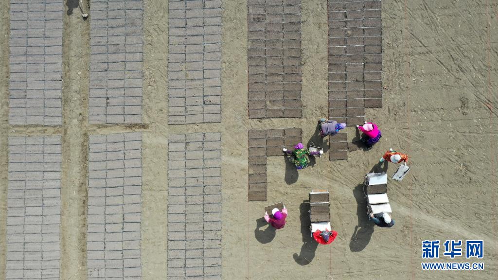 4月3日,唐山蘆臺經濟開發區四分場的農民在稻田地里碼放育苗盤(無人機照片)。春耕時節,河北省唐山市蘆臺經濟開發區農民搶抓農時,開展稻田整地、水稻育秧等工作。新華社發(董軍 攝)