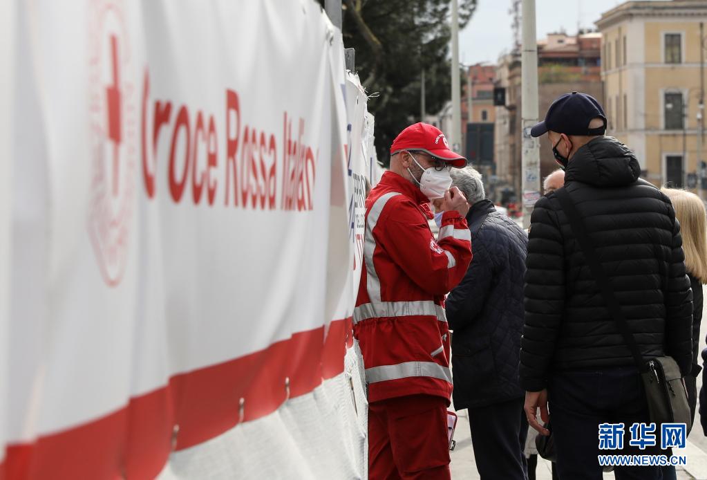 4月3日,人們在意大利羅馬一處新冠疫苗接種點門口登記準備進入。