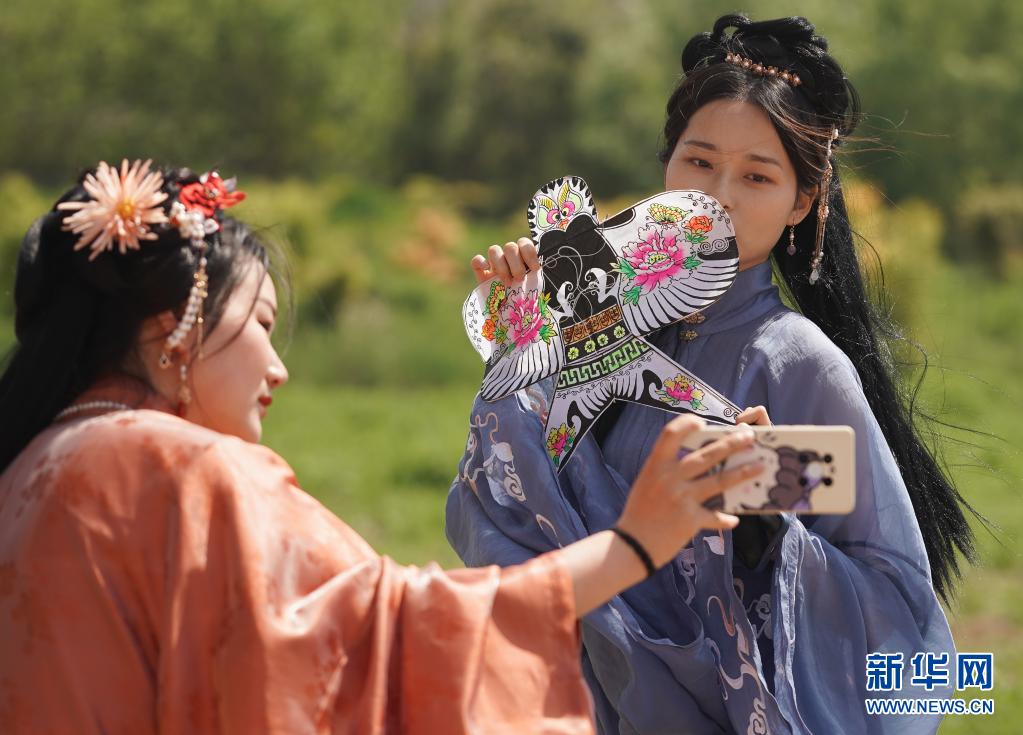 4月10日,人們在第二屆金陵風箏會上拍照留念。當日,第二屆金陵風箏會在江蘇省南京市浦口區(qū)永寧街道舉行。人們放飛風箏,歡度快樂時光。新華社記者 季春鵬 攝