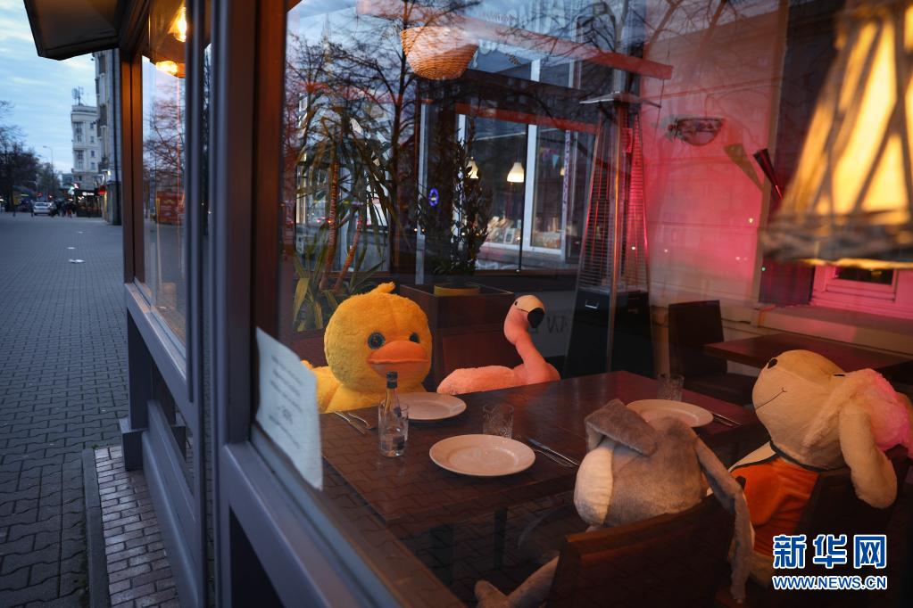 4月13日,波蘭首都華沙一家餐館將動物玩偶擺放在靠窗座位上吸引顧客。