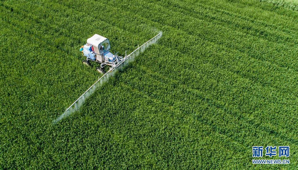 4月20日,在江蘇省海安市隆政街道聯合村,農民駕駛自走式噴桿噴霧機在麥田噴灑農藥(無人機照片)。