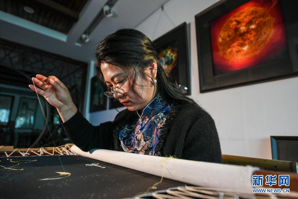 陳英華在位于蘇州高新區鎮湖街道的蘇繡工作室內刺繡(4月14日攝)。