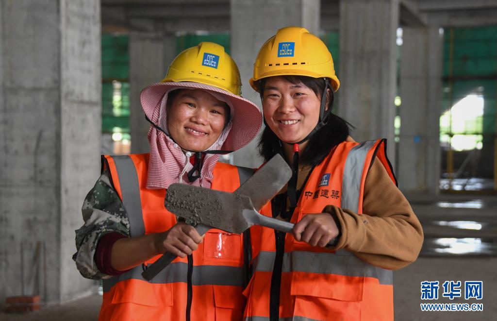 4月28日,姐姐蔡明梅(左)和妹妹蔡明娥在武漢湖北廣電傳媒基地項目工地上留影。