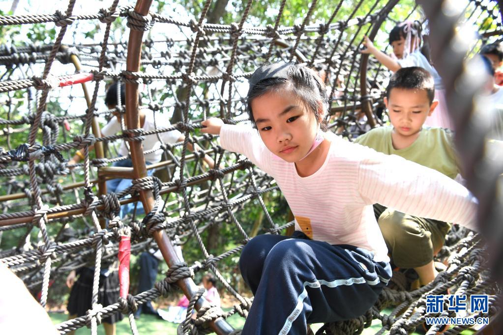 5月1日,孩子們在廣西南寧市青秀山風景區陸地拓展競技樂園玩耍。