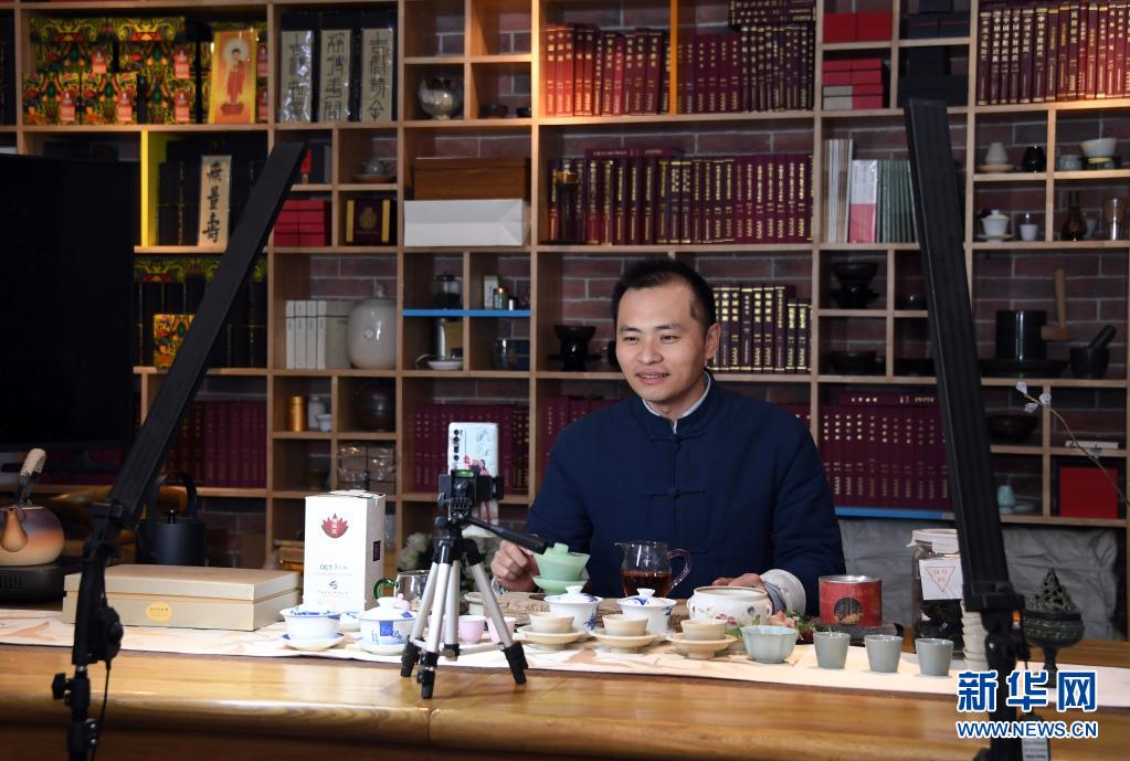 李卓澄在“小茶館”中通過(guò)視頻直播的方式向觀眾介紹茶知識(shí)(4月29日攝)。新華社記者 趙婷婷 攝