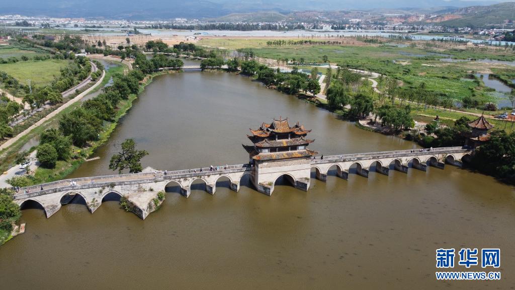 5月3日,游客在云南省紅河哈尼族彝族自治州建水縣建水古城雙龍橋景區游覽(無人機照片)。新華社發(楊俊鵬 攝)