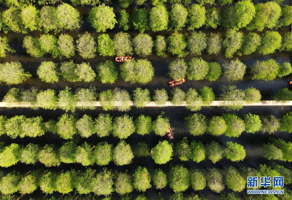 5月3日,在江蘇省揚州市淥洋湖濕地公園,游客在水上森林劃船游玩(無人機照片)。新華社發(孟德龍 攝)