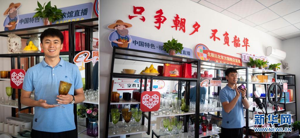拼版照片:左圖為胡翔宇展示山西省祁縣產的玻璃杯;右圖為胡翔宇通過網絡直播介紹玻璃杯(7月6日攝)。今年31歲的胡翔宇是祁縣南關村人,在從事農村電商之前,他做過工程設計、當過教師。2019年,胡翔宇回到家鄉,開始從事祁縣特產和特色農產品的銷售。2021年,南關村成立了電商平臺,為返鄉青年提供創業服務和便利條件,胡翔宇和他的團隊第一時間入駐。為拓寬銷售渠道,他開始嘗試直播帶貨,1個多月的時間,粉絲量已經突破3000余人。