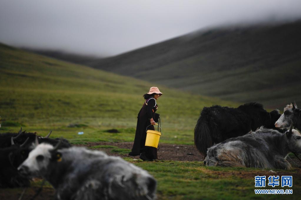 8月3日,在瑪沁縣當洛鄉貢龍村的夏季草場上,牧民準備擠牛奶。