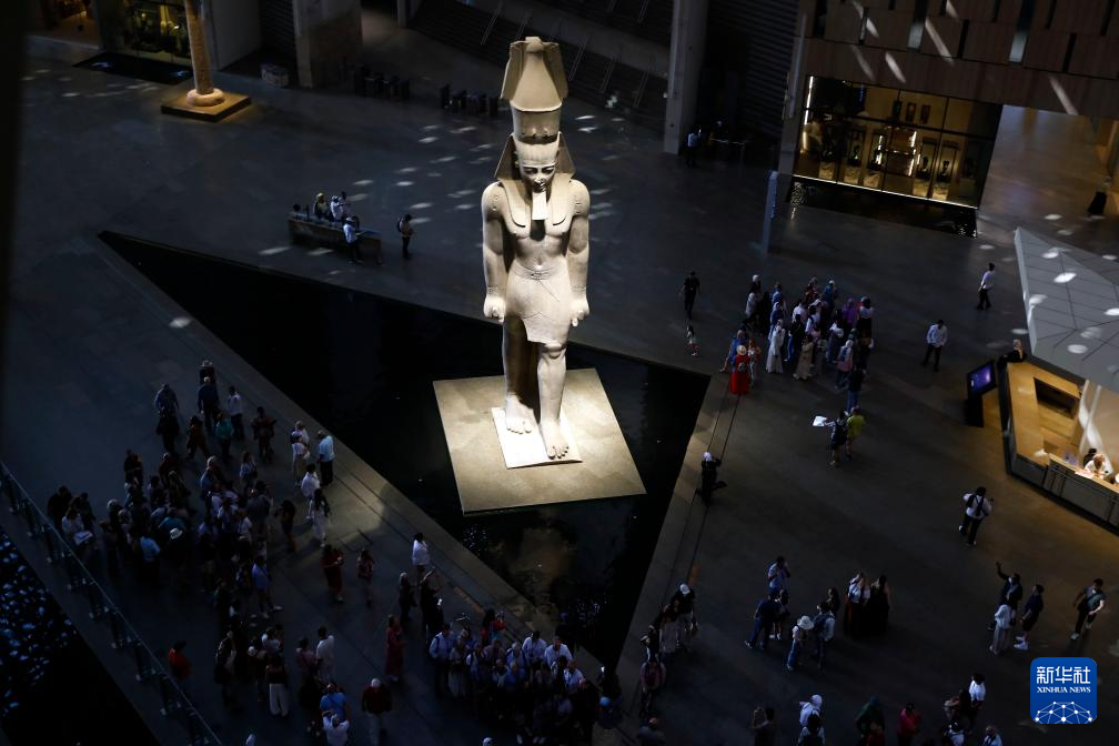 10月14日,在位于埃及吉萨省的大埃及博物馆,游客在古埃及法老拉美西斯二世的巨像旁参观。
