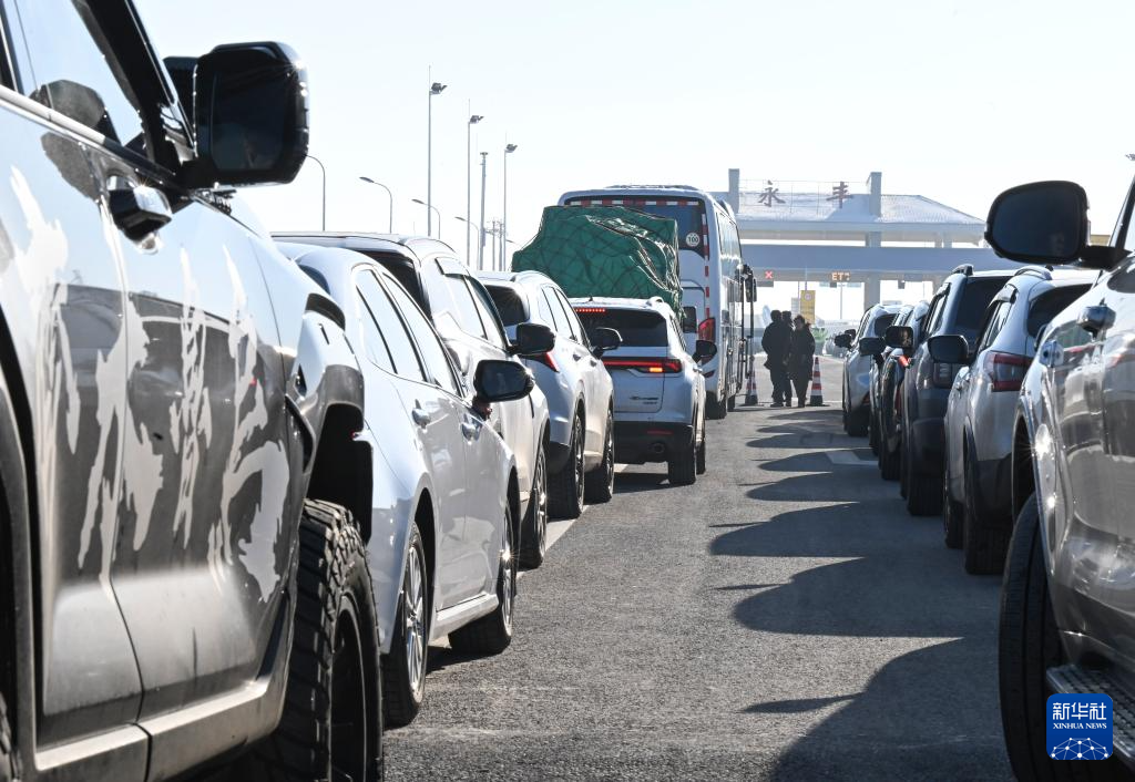 12月26日,在乌尉高速公路的永丰收费站附近,人们驾车排队等待通行。