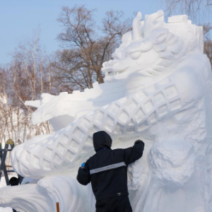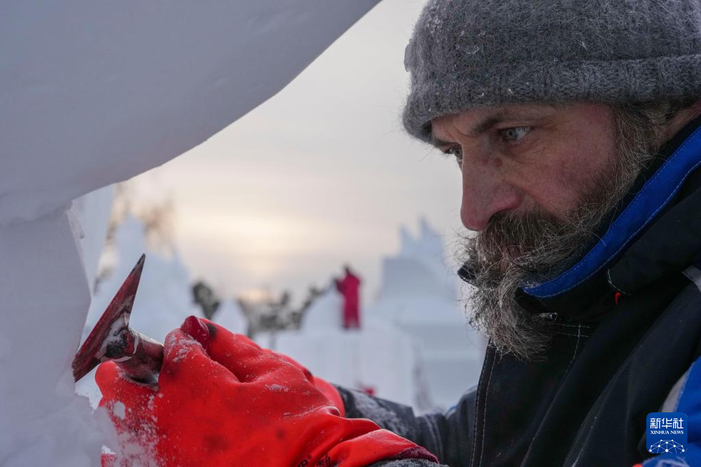 1月9日,参赛选手在进行雪雕作品《驯牛者》收尾工作,作品最终获三等奖。