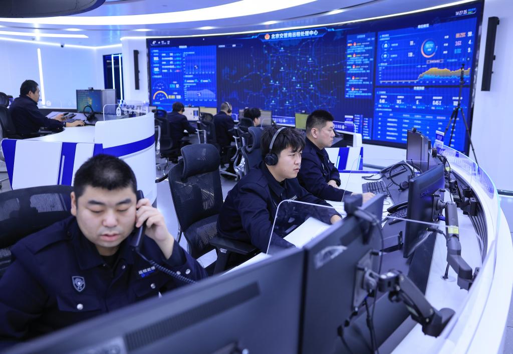 1月7日,在北京市道路交通事故警保合作远程处理中心,民警和远程处理专席人员、远程处理理赔专席人员在进行交通事故远程处理。