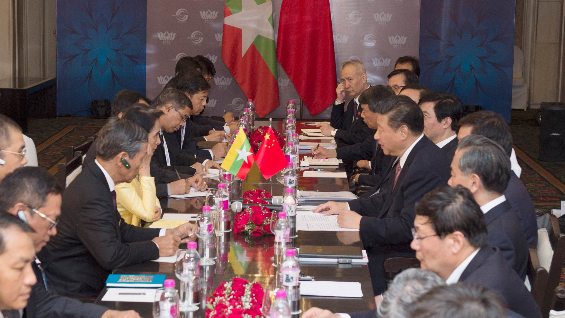 10月16日,國(guó)家主席習(xí)近平在印度果阿會(huì)見(jiàn)緬甸國(guó)務(wù)資政昂山素季。 新華社記者 王曄 攝