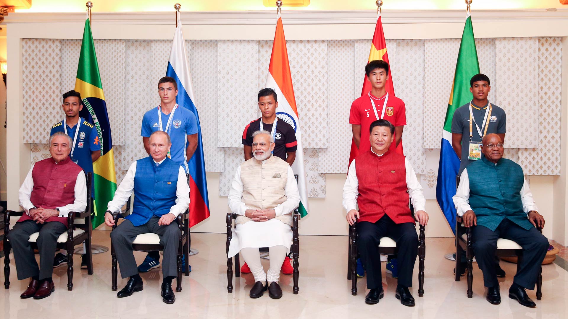 10月15日,國(guó)家主席習(xí)近平與印度總理莫迪、南非總統(tǒng)祖馬、巴西總統(tǒng)特梅爾、俄羅斯總統(tǒng)普京在印度果阿同參加金磚國(guó)家17歲以下少年足球賽的各國(guó)代表隊(duì)隊(duì)長(zhǎng)合影。新華社記者 姚大偉 攝