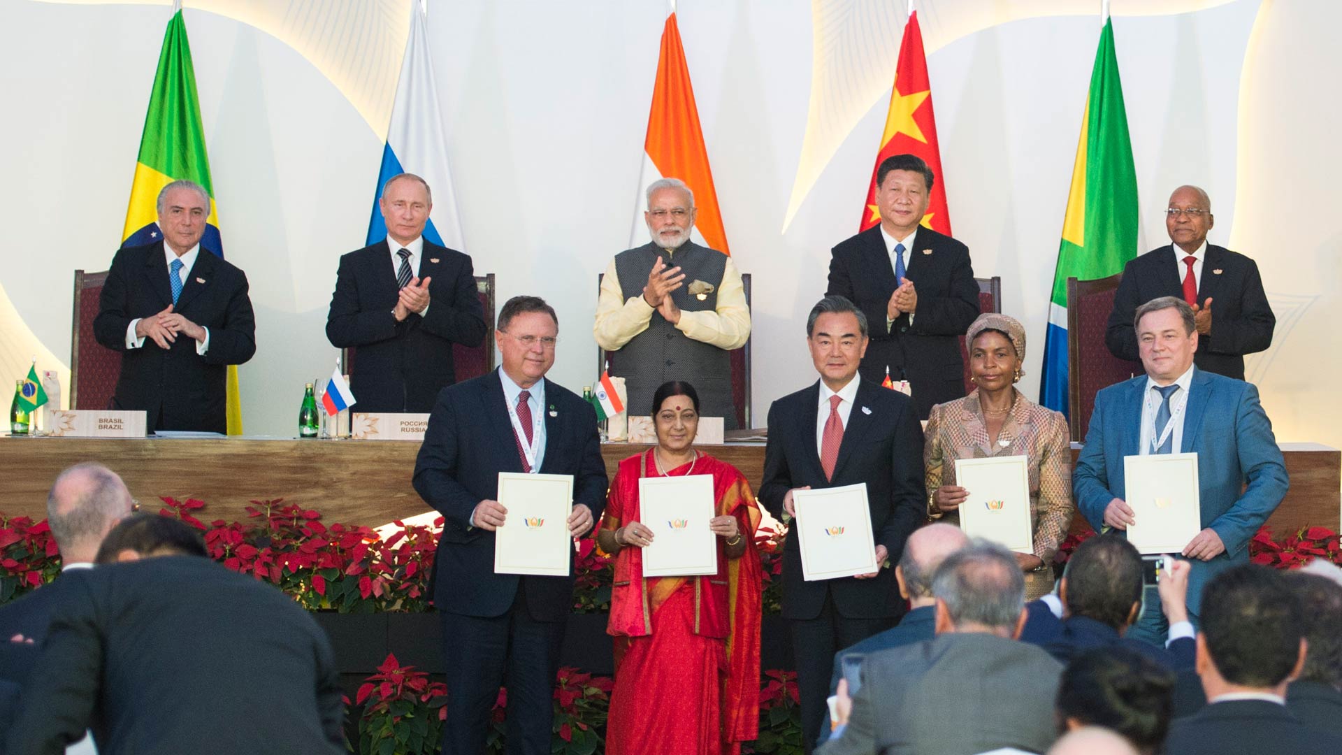 10月16日,金磚國(guó)家領(lǐng)導(dǎo)人第八次會(huì)晤在印度果阿舉行。中國(guó)國(guó)家主席習(xí)近平、印度總理莫迪、南非總統(tǒng)祖馬、巴西總統(tǒng)特梅爾、俄羅斯總統(tǒng)普京出席。這是會(huì)晤結(jié)束后,5國(guó)領(lǐng)導(dǎo)人共同見(jiàn)證合作文件的簽署,并出席聯(lián)合記者會(huì)。新華社記者 謝環(huán)馳 攝