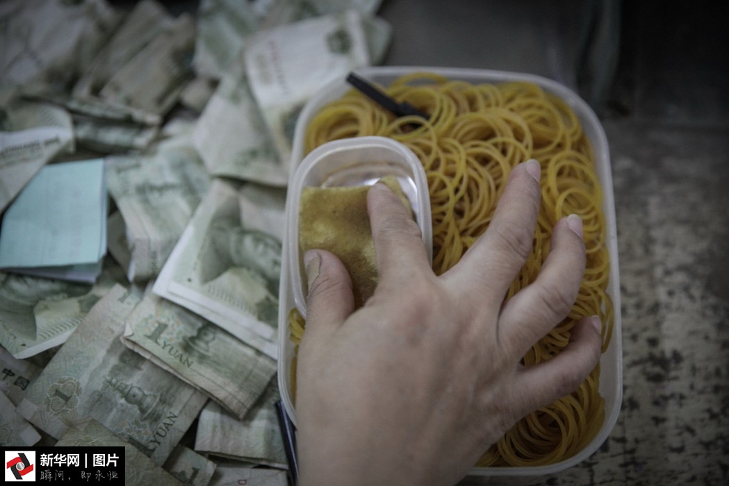 點鈔員肖冬常年累月的坐著重復數(shù)錢的動作,讓她的腰椎和頸椎常常感到不適,“轉眼間,已經(jīng)當了20多年的點鈔員,這些年數(shù)過多少錢肯定沒有準確數(shù)據(jù)了,從一天數(shù)幾百張到如今的一萬多張,是時間教會人成長。”圖為點鈔員沾濕手指準備點鈔。