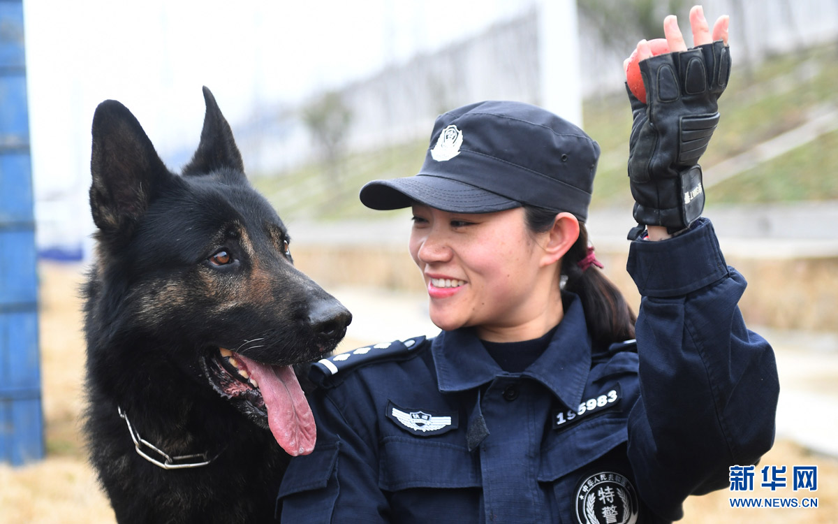 2月5日,劉慧和“威利”在警犬基地玩耍。劉慧是武漢鐵路公安局襄陽公安處警犬工作隊的一名民警,“威利”是一只2013年出生的德國牧羊犬,經過嚴格訓練后擔任搜爆犬。劉慧和“威利”自2013年起開始了朝夕相處的生活,今年春運是劉慧和“威利”一起搭檔值勤的第四個春運。春運期間,劉慧和“威利”每天都要進駐襄陽火車站開展安保巡邏工作,共同保障春運安全。 新華社記者 程敏 攝