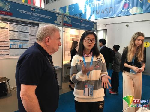 歐盟青少年科學(xué)家競(jìng)賽中,賀婉卓正在向外國(guó)專(zhuān)家做講解。本人供圖
