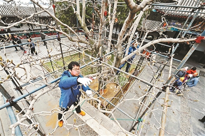 “為了修剪一棵樹而專門搭起腳手架,所做功夫之細(xì),這在北京城里也是較為少見的。”頤和園古樹管護(hù)中心負(fù)責(zé)人韓紅巖說,其目的是盡最大努力保護(hù)古樹。如果用梯子,移動(dòng)的時(shí)候容易把花苞碰掉,損壞枝條。樹冠深處的一些花苞也夠不著,存在修剪死角。頤和園采用搭腳手架這種獨(dú)有的修剪方式,所有問題也就迎刃而解了。