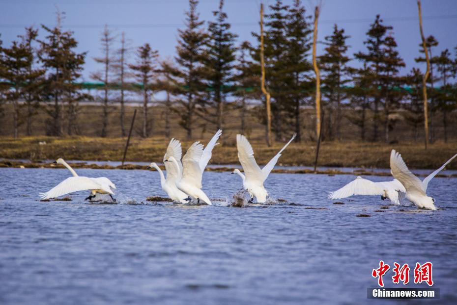 3月20日,天鵝在湖面上“舞蹈”。日前,內蒙古自治區呼倫貝爾市陳巴爾虎旗陸續迎來大量北歸天鵝。據了解,每年四月份,成群的天鵝從中國南方遷徙到呼倫貝爾產卵繁殖,而今年三月中旬起,陳巴爾虎旗境內便迎來大量回歸天鵝,實屬罕見。中新社記者 武軍 攝