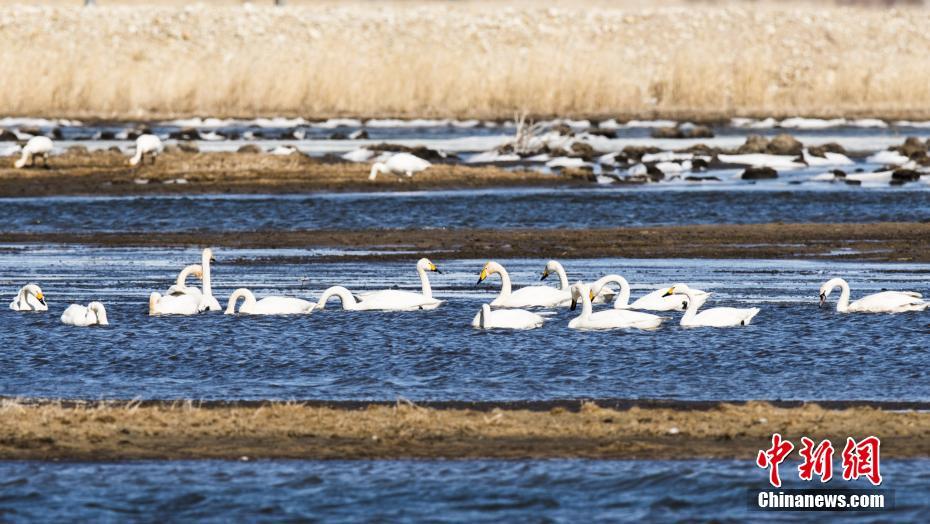 3月20日,天鵝在湖面上棲息。日前,內蒙古自治區呼倫貝爾市陳巴爾虎旗陸續迎來大量北歸天鵝。據了解,每年四月份,成群的天鵝從中國南方遷徙到呼倫貝爾產卵繁殖,而今年三月中旬起,陳巴爾虎旗境內便迎來大量回歸天鵝,實屬罕見。中新社記者 武軍 攝
