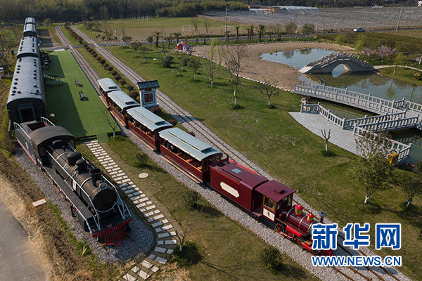 游客乘坐觀光小火車從浙江省安吉縣魯家村的休閑驛站邊駛過(3月23日無人機拍攝)。新華社記者 黃宗治 攝