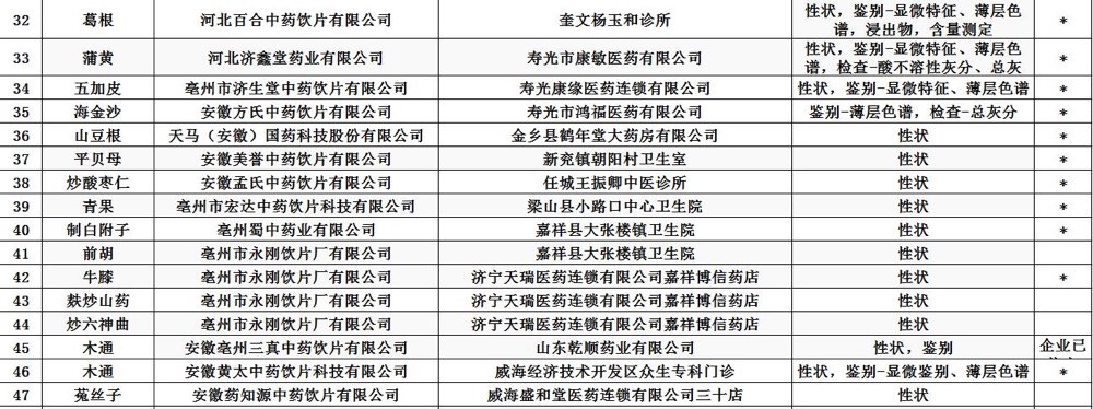 經(jīng)濱州市食品藥品檢驗檢測中心等14家藥品檢驗機構(gòu)檢驗,標示為河北凱諾制藥有限公司等2家企業(yè)生產(chǎn)的2批次藥品,標示為金芍堂中藥飲片有限公司等47家企業(yè)生產(chǎn)的70批次中藥飲片不合格。