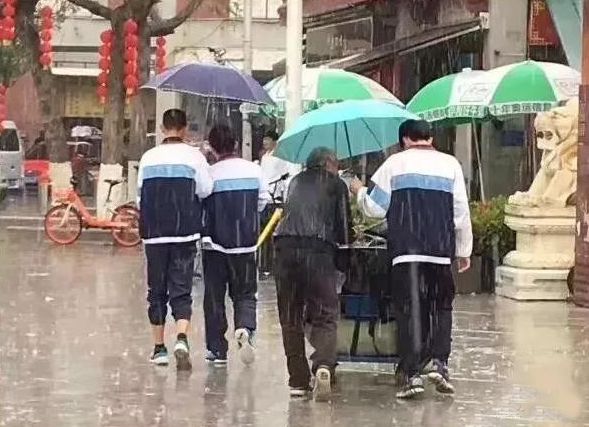 看到一位推車老人沒有傘