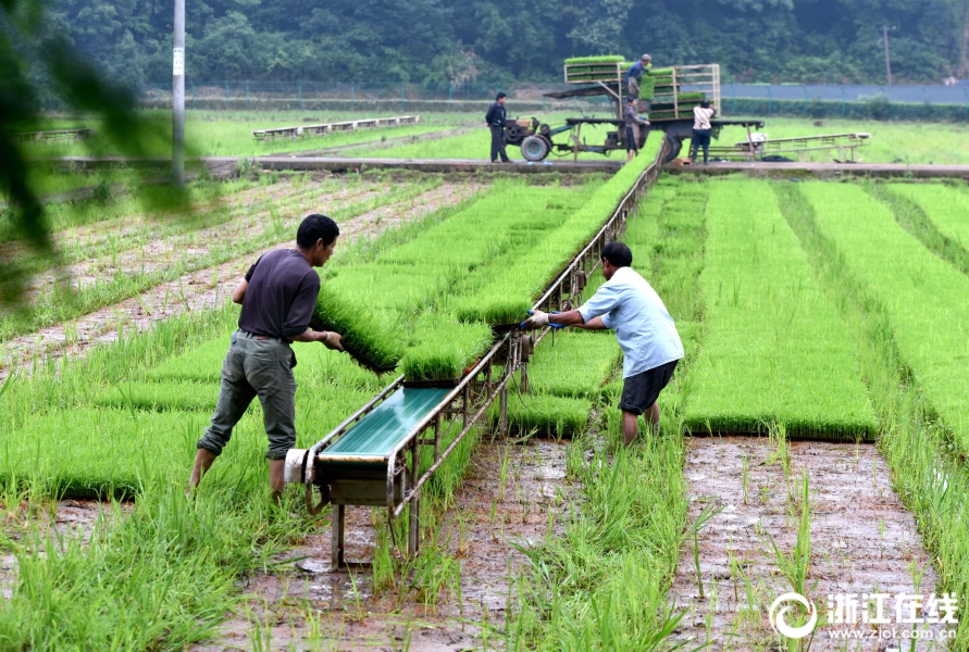 6月4日,武義縣一育秧工廠員工忙著為訂單農戶起運單季稻秧苗。隨著“芒種”節氣的到來,武義縣農民搶抓有利時機,加快翻耕平整水田,搶種單季水稻。(浙江在線拍友 張建成 攝)