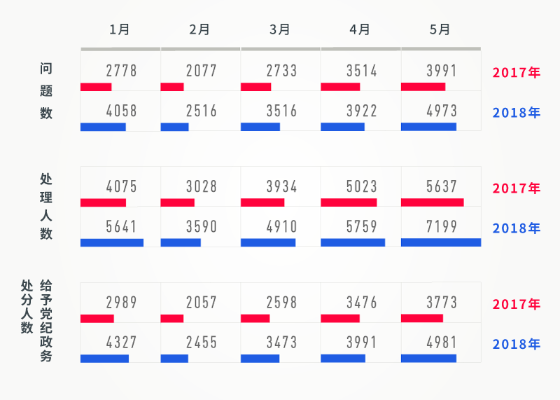 仔細梳理發現,今年1-5月,每月全國查處違反中央八項規定精神問題數、處理人數、給予黨紀政務處分人數相比去年同期均大幅上升。此外,除2月有下降外,1-5月的各項數據呈逐月攀升趨勢。