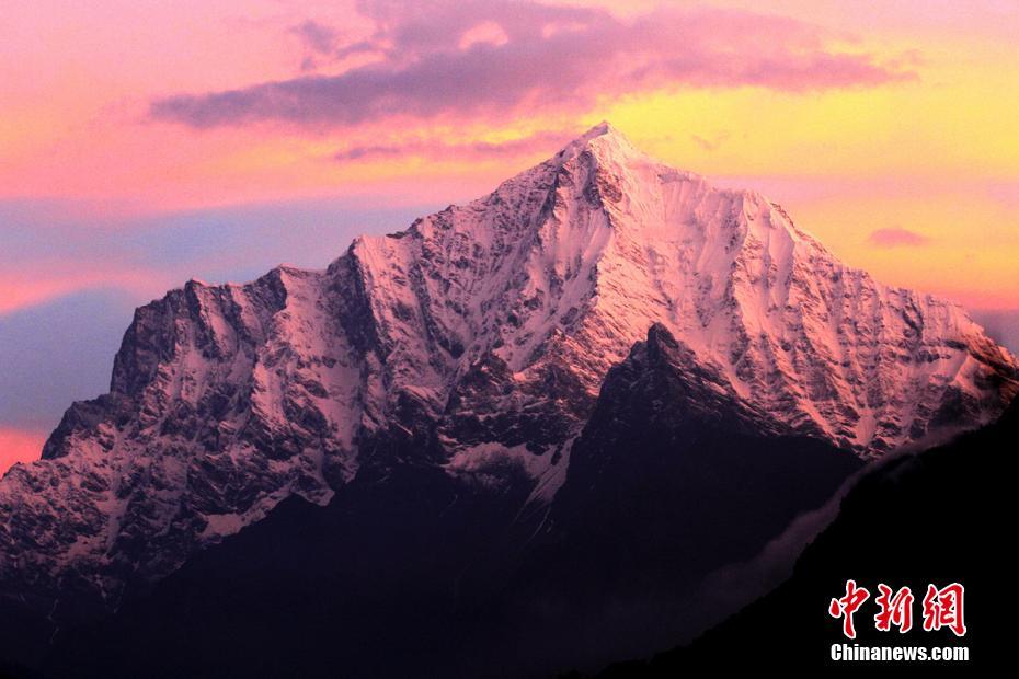 吉隆溝給人最大的感受是驚訝于造物的神奇,讓四季并存在這狹小的山谷間。峽谷綠樹成蔭,恬靜的村莊被綠樹環抱著,不遠處能清楚地看見若隱若現的雪山。圖為紅霞映雪山。 楊建 攝
