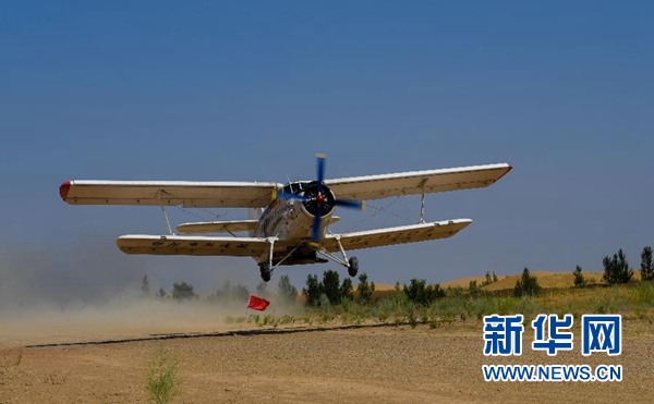 在內(nèi)蒙古鄂爾多斯市的庫布其沙漠腹地,一架飛播造林用的飛機起飛(7月11日攝)。 新華社記者 彭源 攝