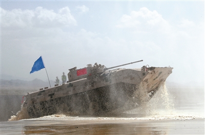 “蘇沃洛夫突擊”步戰車組項目比賽中,中國參賽隊戰車穿越涉水場。袁 凱攝