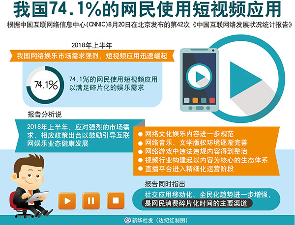 新華社北京8月20日電(記者施雨岑、王思北)根據中國互聯網絡信息中心(CNNIC)20日在京發布的第42次《中國互聯網絡發展狀況統計報告》,2018年上半年,我國網絡娛樂市場需求強烈,短視頻應用迅速崛起,74.1%的網民使用短視頻應用,以滿足碎片化的娛樂需求。