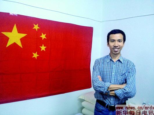 2015年3月空襲時,劉萬利在中國駐也門使館地下室與國旗合影。劉萬利(國際部)