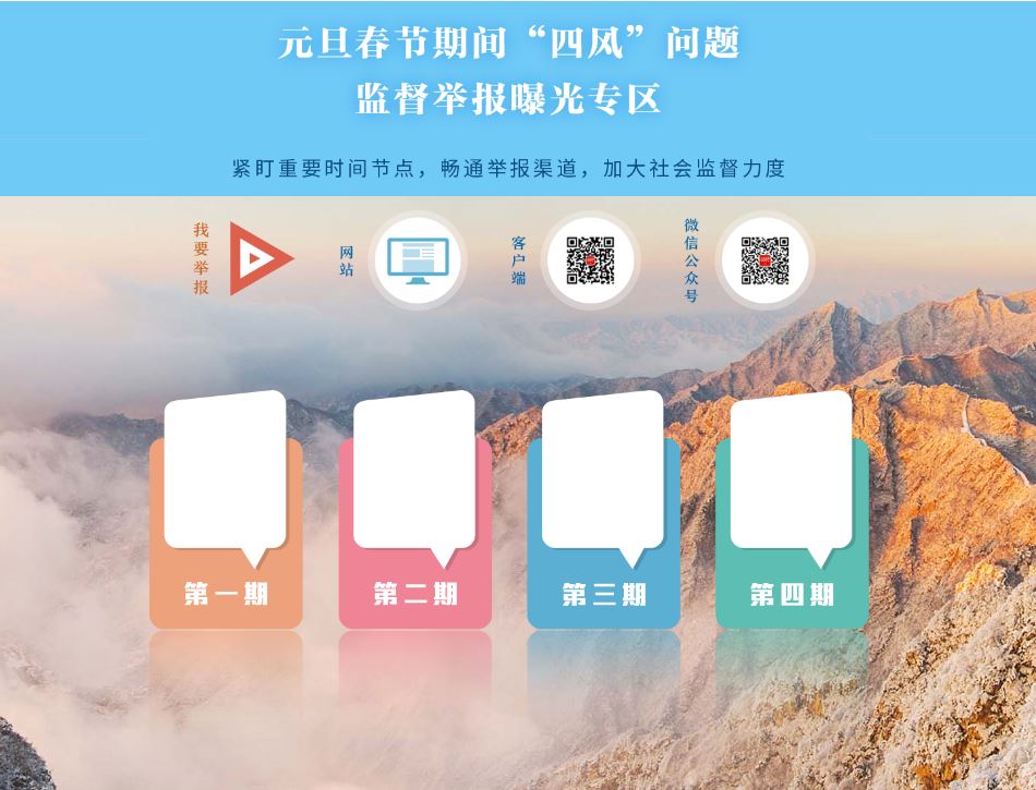 2019年元旦、春節(jié)將至,為切實(shí)抓好節(jié)日期間落實(shí)中央八項(xiàng)規(guī)定及其實(shí)施細(xì)則精神、糾正“四風(fēng)”工作,營(yíng)造風(fēng)清氣正節(jié)日氛圍,中央紀(jì)委國(guó)家監(jiān)委網(wǎng)站推出“元旦春節(jié)期間‘四風(fēng)’問(wèn)題監(jiān)督舉報(bào)曝光專(zhuān)區(qū)”,暢通監(jiān)督舉報(bào)渠道,加大典型案例通報(bào)曝光力度,增強(qiáng)警示震懾和教育引導(dǎo)作用。