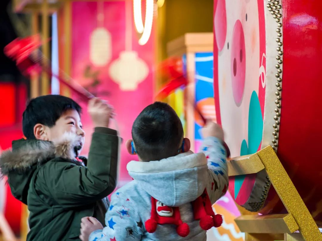 2019-02-01,上海市豫園商城。上海市豫園主題燈展的吉祥大鼓吸引了眾多游客,孩子們?cè)诩议L的帶領(lǐng)下紛紛排隊(duì)上前擂鼓。作者:阿湯哥