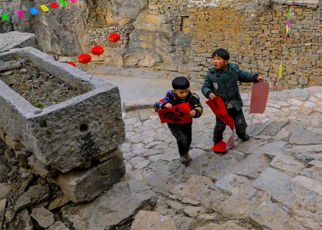 2019-01-29,河北省涉縣大洼村。新春到來之際,書畫大師下鄉進山溝,揮毫潑墨送溫暖,倆村娃興致勃勃將福字春聯帶回家。作者:滄海