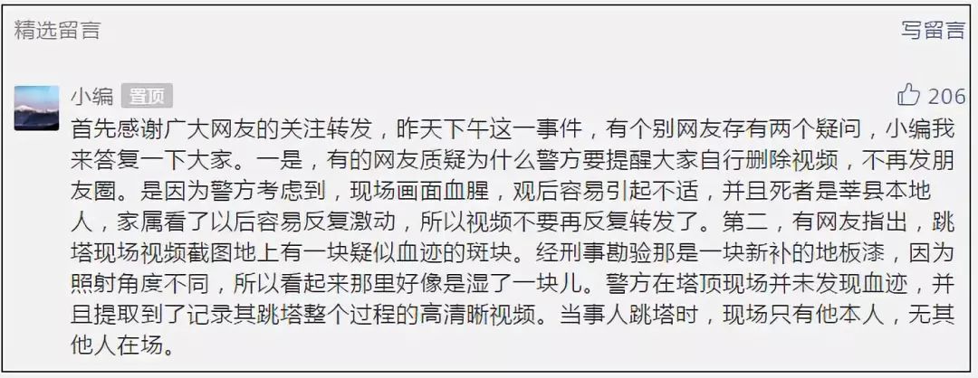 “我們就在通報的基礎上,通過留言進行了辟謠和提醒。”警方表示,就此事有個別網友存有兩個疑問:一是,質疑為什么警方要提醒大家自行刪除視頻。警方解釋,現場畫面血腥,觀后容易引起不適,并且死者是莘縣本地人,家屬看了以后容易反復激動。二是,網友指出,跳塔現場視頻截圖地上有一塊疑似血跡的斑塊。經刑事勘驗那是一塊新補的地板漆,因照射角度不同,所以看起來那里好像是濕了一塊兒。警方在現場并未發現血跡,此外,當事人跳塔時,現場只有他本人。