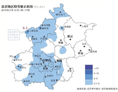 監測顯示,12日01時至16時,北京全市平均降雪量0.5毫米,城區平均0.6毫米,最大降雪出現在延慶二海坨3.1毫米。